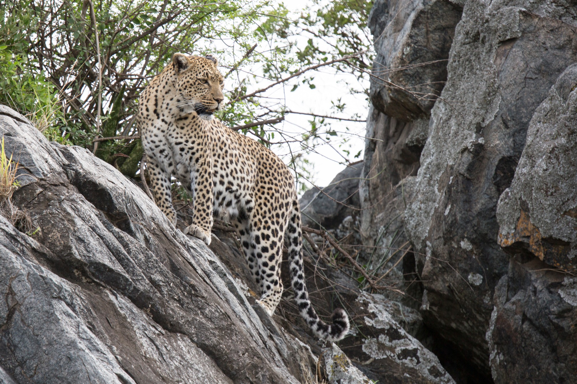 Growing up in Africa, Tricia has been in about 20 game parks but had never seen a leopard. They are largely nocturnal and very elusive. She told Vincent, our guide from Exotic Expeditions, that she wanted him to find her a leopard today. Well, it was our lucky day as we came across a leopard. High in a large rock outcropping you could see some movement behind the trees. It was difficult to tell it was a leopard but Vincent said he could see it. Patience and luck are the keys to wildlife photography – and a big telephoto lens! After about 30 minutes, the leopard came out from the brush and appeared ready to have a few photos taken.