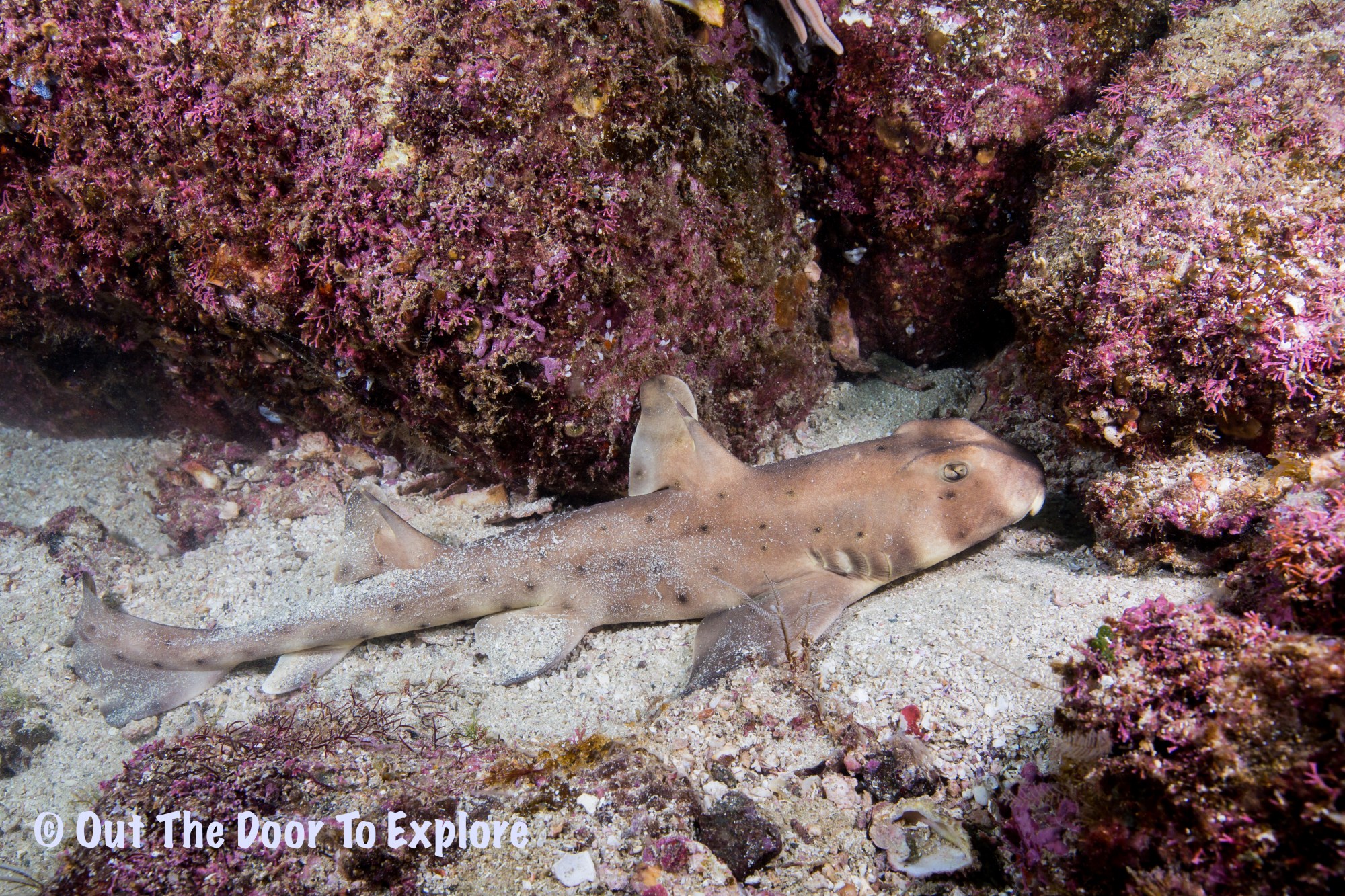 The purpose of our dive was to photograph Horn sharks and we got lucky on our second dive around Danzante Island in the Loreto Bay National Marine Park, Sea of Cortez, Mexico. Thank you to Juan Carlos Reyes Valerio our dive master for finding these rather reclusive sharks. Although we found 3 different horn sharks, 2 were deep in crevices and they were impossible to photograph. However, it only takes one and this shark was out in the open apparently waiting to be photographed. Horn sharks are not strong swimmers and this shark is trying to tuck as close to the rocks as possible.