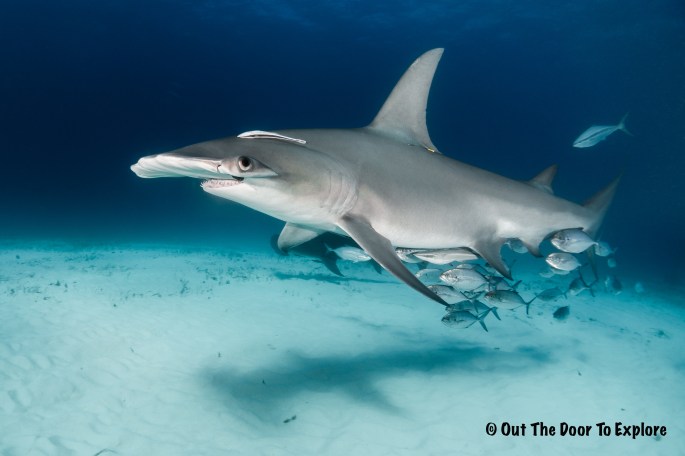 Great hammerheads are newer sharks on the evolutionary scale and have developed some unusual characteristics. The unique feature of this shark is obviously the head. The “hammer” which is called a cephalofoil is full of electrical sensors. These pores called ampullae of Lorenzini aid in hunting as these sensors pick up electrical signals given off by all living creatures including humans.