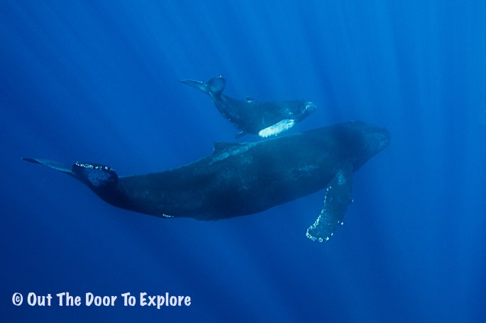 We have over 500 dives and have never encountered humpback whales underwater. In Hawaii, we have heard the males singing during our dives but they always seem to avoid us. All that changed in the Socorro islands (Revillagigedo Archipelago). We had a very brief encounter (about 10 -15 seconds) with a mother and her calf. They were moving toward us but immediately turned away to avoid us, but this allowed for a couple of quick photographs. This was a very surreal experience to see a 13-15 meter (40-50 foot) whale and calf such a short distance from us!humpback8